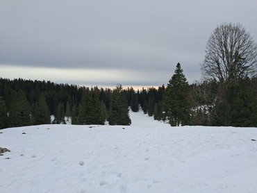Die Sonne kam etwas hinter den Wolken hervor, als sich unsere 10-köpfige, altersmäßig gemischte Gruppe pünktlich um 10h15 am Gare de la Givrine im schweizer Teil des Jura traf. Einige Teilnehmer reisten per PKW an und andere mit dem Zug. Frischen Schnee gab es leider nicht, so dass wir uns also - nachdem wir uns bekannt gemacht hatten - ohne Schneeschuhe auf den Weg zum Chalet d'alpage du Vermeilley machten. Da die Wettervorhersage recht unsicher war, freuten wir uns, dass wir trocken nach einem 90-minütigen Marsch beim Chalet ankamen. Die Sonne war zeitweise zu sehen und mutig aßen wir auf der Terrasse des Chalets. Das Wetter hielt durch, nur ganz am Schluss mussten wir uns etwas mit dem Käsefondue sputen, da ein paar Tropfen vom Himmel fielen.
